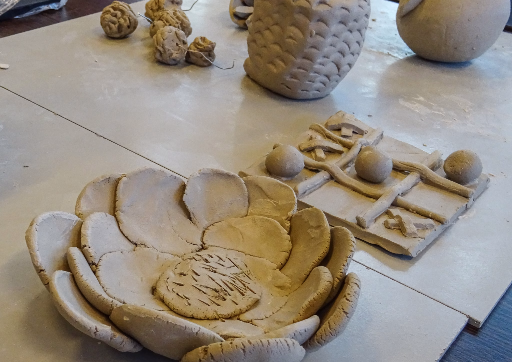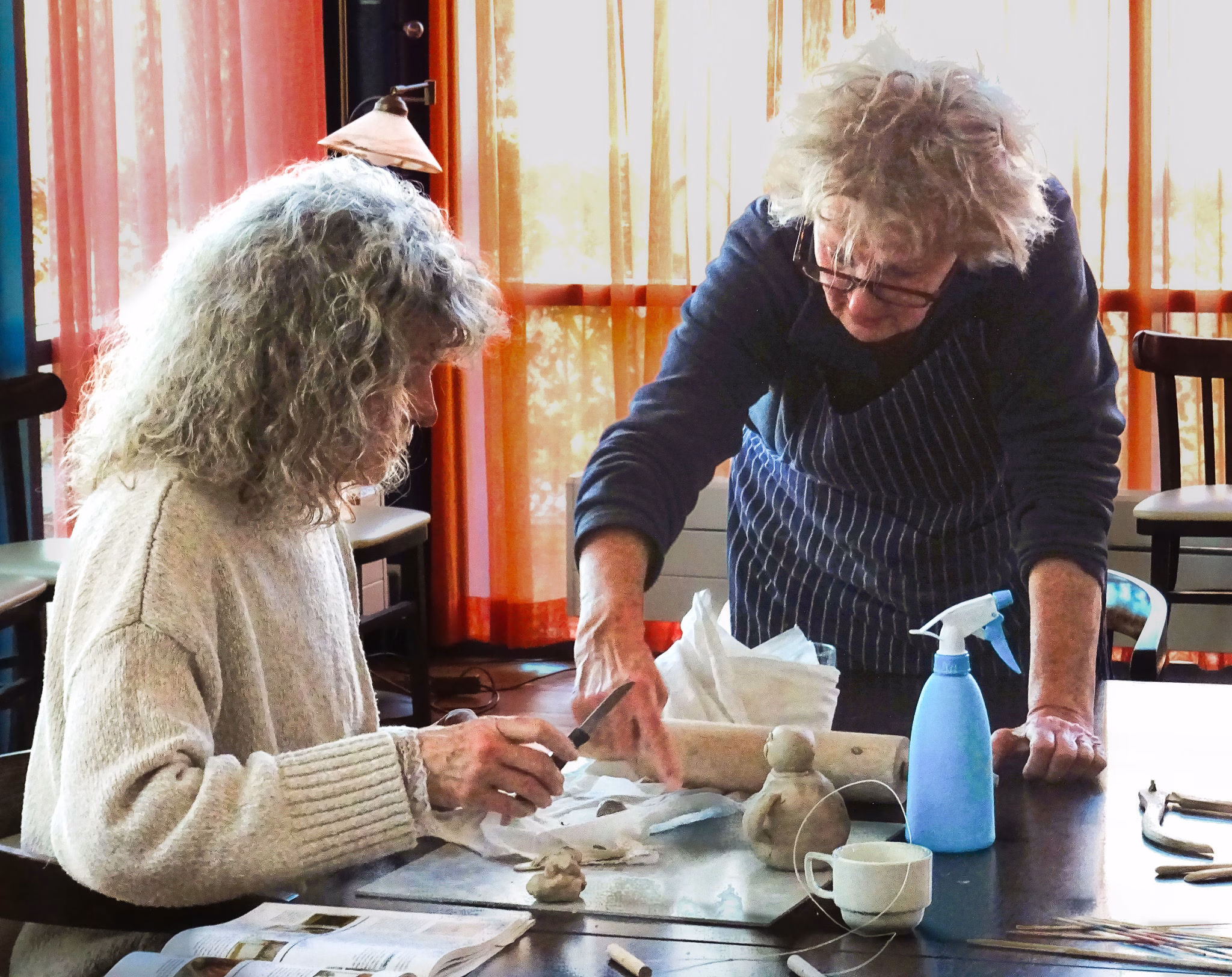 Uit een blok chamotteklei, met wat eenvoudig gereedschap en de uitleg van Carien en Hetty, kwamen er al snel voorzichtige probeerseltjes op tafel. Met de technische tips van de begeleidende kunstenaars werd daar verder aan gewerkt, zodat elke deelnemer ten slotte met een geslaagd keramiek object naar huis ging.